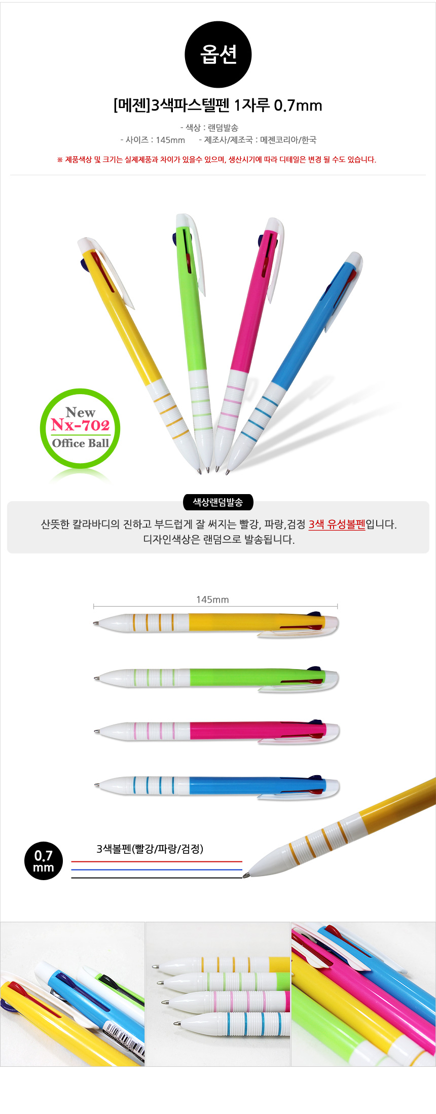 메젠코리아 3색볼펜 0.7 (랜덤) 낱개1자루 > 유성펜