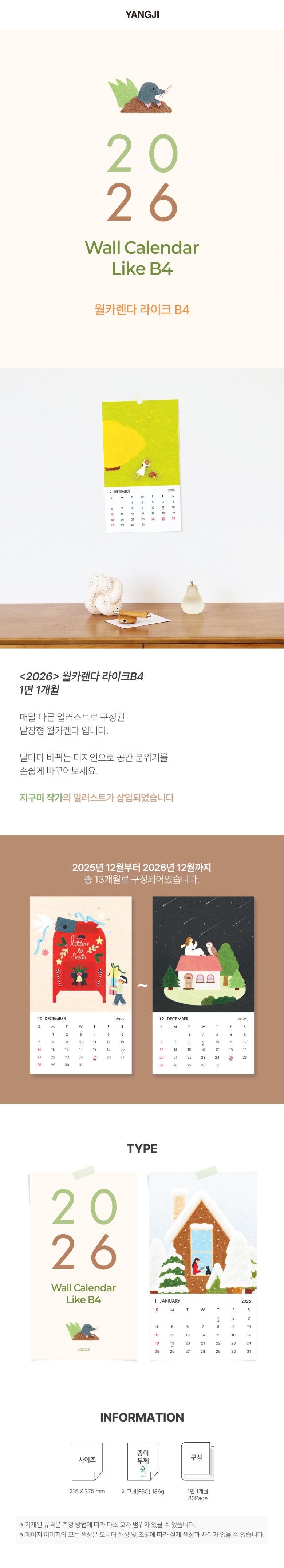 • 양지다이어리 월카렌다 라이크B4 1면 1개월 215x375mm 캘린더 달력